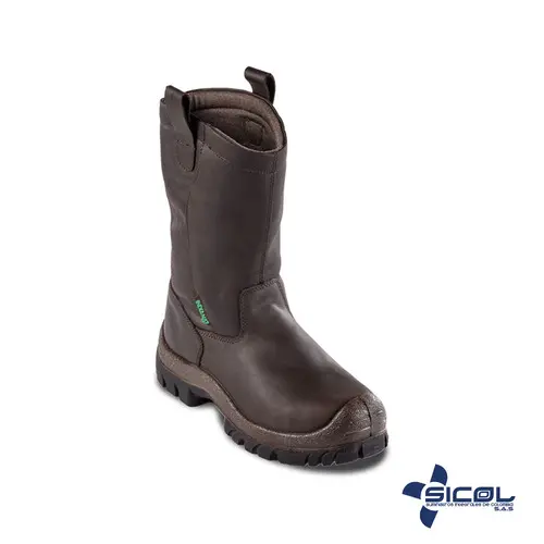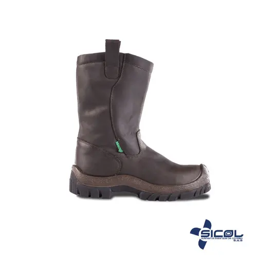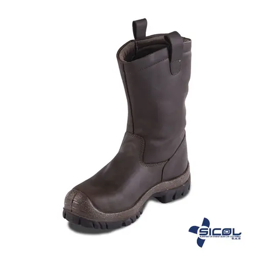 Calzado de seguridad, color café oscuro en cuero graso, caña alta, suela inyectada en poliuretano, resistente a hidrocarburos, dieléctrica, puntera en policarbonato (NO METÁLICA)
