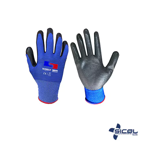 Guante Wave Nitrilo Fabricado en poliéster de 13 Galgas Recubierto en Nitrilo Recubrimiento de Nitrilo tipo ondas soportado en Poliéster para brindar mayor comodidad y agarre, Su diseño y material permite un uso más largo y cómodo La construcción de su tejido permite su uso en labores que demandan agarre, destreza y comodidad, El guante está diseñado bajo los